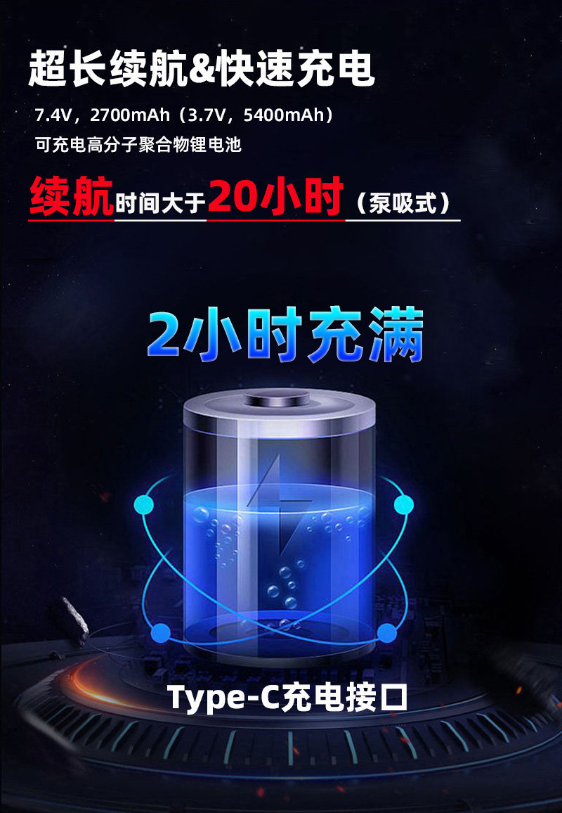 7.4V,2700mAh3.7V,5400mAh)可充電高分子聚合物鋰電池,續航時間大於20小時(泵吸式)